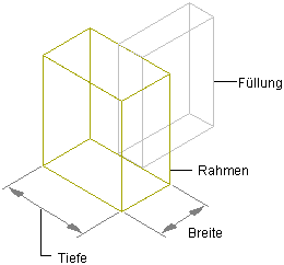 Tipp: Um die Rahmenkante zu entfernen und die Füllung so einzustellen, dass sie den vom Rahmen besetzten Raum ausfüllt, erstellen Sie eine Rahmendefinition, bei der sowohl die Breite als auch die Tiefe auf Null eingestellt ist. Weisen Sie dann diese Definition der Rahmenkante zu, die Sie entfernen möchten. Dies ist erforderlich, damit eine Gehrung der Füllung durchgeführt wird, wie es auch bei rahmenloser Verglasung gemacht würde.