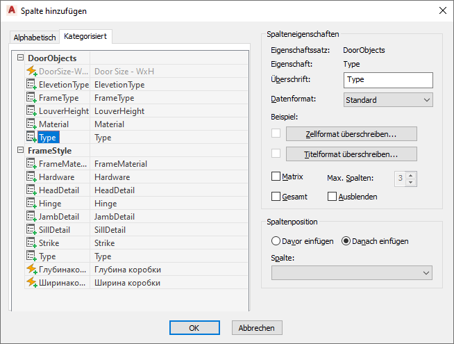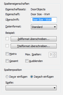 Jede Spalte enthält die Werte für eine Eigenschaft in einem Eigenschaftssatz. Die Eigenschaftssatz-Definitionen für die von Ihnen angegebenen Eigenschaften müssen bereits in der Zeichnung vorhanden sein, bevor Sie Spalten dafür erstellen können.