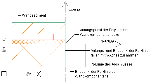 Gültige Wandabschluss-Polylinien beginnen an der Ecke der Wandkomponente auf der Y-Achse. Im Idealfall enden die Polylinien an der anderen Ecke der Wandkomponente auf der Y-Achse, sodass Anfangs- und Endpunkt der Polylinie auf der Y-Achse liegen und den gleichen X-Wert haben (siehe Abbildung).