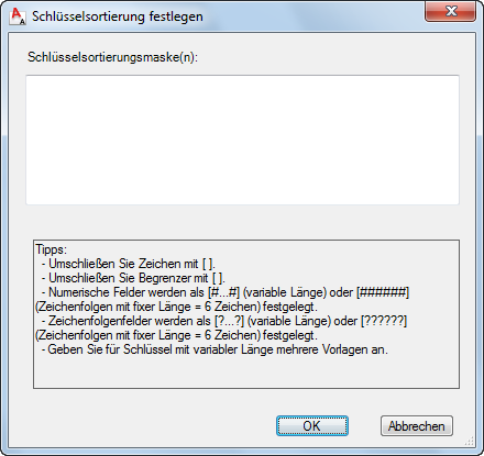 Gehen Sie wie folgt vor, um die Reihenfolge der Bauelementschlüssel in einer Datenbank festzulegen, in der sie im Bauelementschlüssel-Editor, dem Dialogfeld Bauelementschlüssel einfügen oder den Bauelementschlüssel-Legenden angezeigt werden. Dazu geben Sie eine oder mehrere Masken ein, die den für die Schlüssel in der Datenbank verwendeten Mustern entsprechen. Bauelementschlüssel werden innerhalb jedes Musters feldbasiert sortiert. In anderen Worten, alle Bauelementschlüssel mit demselben Schlüsselmuster wie die erste Maske, die Sie eingeben, werden vor den Bauelementschlüsseln aufgeführt, die dem Schlüsselmuster der zweiten eingegebenen Maske entsprechen.