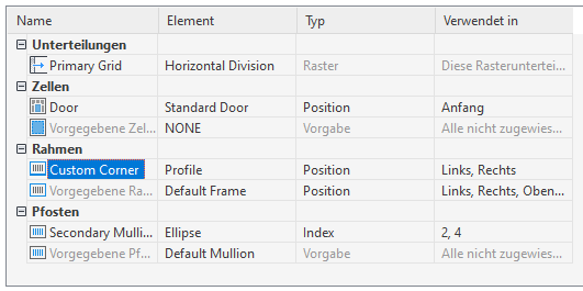 Nachdem Sie Elementdefinitionen für einen Tür-Fenster-Kombinationsstil erstellt haben, können Sie diese Definitionen den verschiedenen Elementtypen für Tür-Fenster-Kombinationen zuweisen: Unterteilungen, Zellenfüllungen, Rahmen und Pfosten.