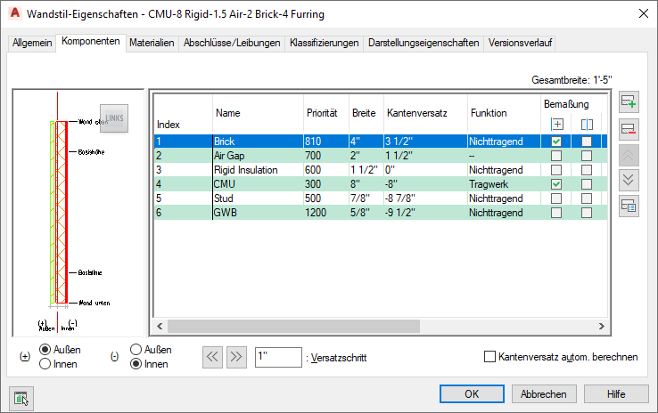 Stellen Sie so viele Informationen zur Wandstruktur wie möglich im Namen selbst zur Verfügung. Dadurch wird es einfacher, zwischen Wandstilen in einer langen Liste zu unterscheiden, ohne in der Wandstilbeschreibung nachsehen zu müssen. Die zuerst aufgeführte Komponente ist die wesentliche Strukturkomponente. Die zuletzt aufgeführte Komponente ist normalerweise eine Abschlusskomponente.