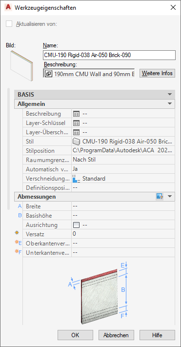 Der einzige wandbasierte Stil, der einem palettenbasierten Werkzeug zugewiesen werden kann, ist der Wandstil selbst. Es werden allerdings beim Verwenden des Stils alle zugehörigen untergeordneten Stile wie Wandabschlussstile und Wandleibungsstile automatisch ebenfalls importiert. Außerdem sollten einige Werkzeugeigenschaften vor dem Speichern des Werkzeugs in einen Katalog als Standards festgelegt werden: