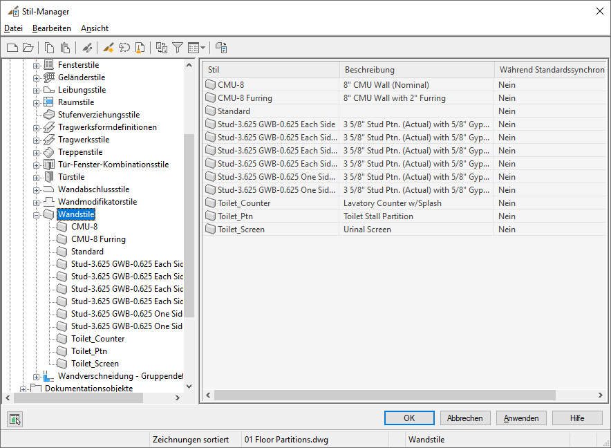 Der Stil-Manager ist ein AutoCAD Architecture 2027-Toolset-Dienstprogramm, mit dem ein zentraler Ort für das Anzeigen von und Arbeiten mit Stilen, die die Darstellung und Funktion von Objekten in Zeichnungen bestimmen, bereitsteht.