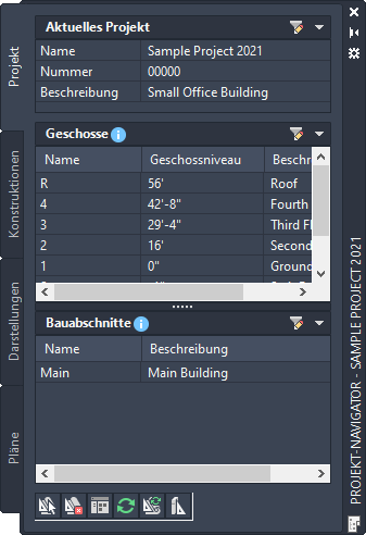 Die Projekt-Navigator-Palette ist der zentrale Ort zum Erstellen, Öffnen und Ändern von AutoCAD Architecture 2027-Toolset-Projektdateien. Normalerweise ist die Projekt-Navigator-Palette im Arbeitsbereich während der Projektarbeit geöffnet.