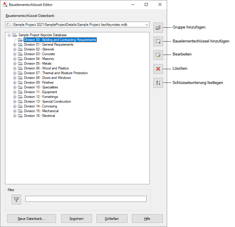 Beim Bauelementschlüssel-Editor handelt es sich um eine eigenständige Anwendung, mit der Sie Bauelementschlüssel-Datenbanken erstellen und bearbeiten können. Der Bauelementschlüssel-Editor wird über das Menü CAD-Manager geöffnet und enthält die eine hierarchische Baumstruktur der aktuell ausgewählten Datenbank, die als Stammknoten angezeigt wird. Bei bestehenden Datenbanken können Sie den Stammknoten erweitern und Gruppen anzeigen, die wiederum erweitert werden können, um Untergruppen oder einzelne Bauelementschlüssel anzuzeigen. Sie können auch Text in das Feld Filter unterhalb der Baumstruktur eingeben. Klicken Sie auf die Schaltfläche Filter, drücken Sie die TABULATORTASTE, oder drücken Sie die EINGABETASTE, um die Anzeige der Knoten unter einem bestimmten Knoten zu erweitern, der die eingegebene Zeichenfolge enthält.