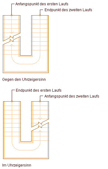 | Erstellen einer U-förmigen Treppe mit der äußeren Treppenkante links und der inneren Kante rechts | Wählen Sie bei Horizontaler Ausrichtung die Option Im Uhrzeigersinn. |
