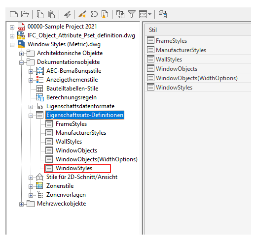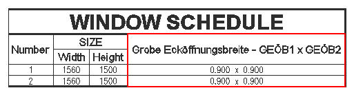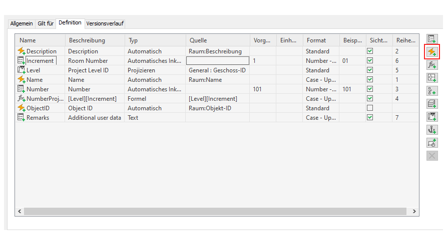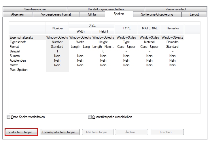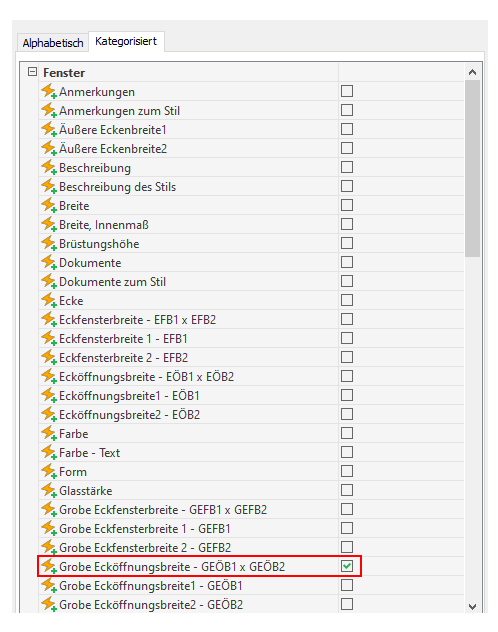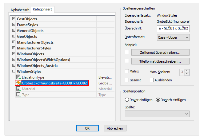 Gehen Sie folgendermaßen vor, um die automatischen Eigenschaften in der Fensterbauteilliste zu ändern: