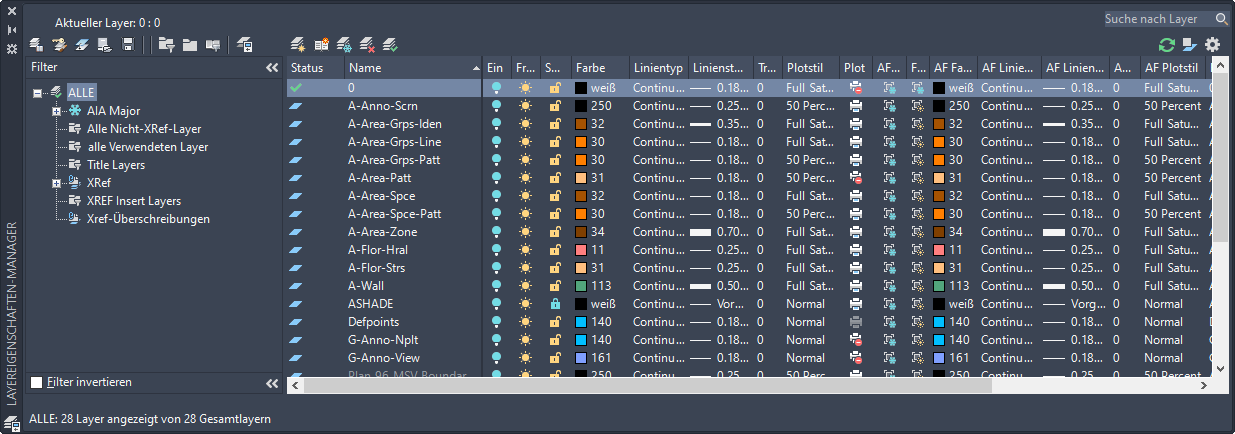 Gehen Sie wie folgt vor, um den Layereigenschaften-Manager zu öffnen. Sobald Sie den Layereigenschaften-Manager öffnen, werden sämtliche Layer der aktuellen Zeichnung im rechten und die Layer-Gruppen im linken Fensterausschnitt des Layer-Managers angezeigt.