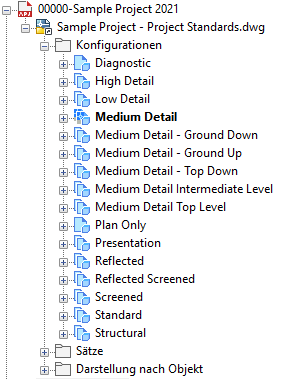 Die Standardanzeigeeinstellungen befinden sich einer dem Projekt zugewiesenen Standardszeichnung. Nachdem Sie eine Gruppe von Anzeigeeinstellungen als Projektstandard festgelegt und in die Projektzeichnungen eingefügt haben, werden diese mit den Standards verknüpft und können mit diesen synchronisiert werden. Über dieselbe Verknüpfung können die Standardanzeigeeinstellungen auch durch die Anzeigeeinstellungen einer Projektzeichnung aktualisiert werden.
