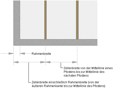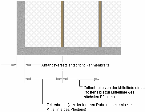 Vorgabemäßig werden Rasterzellen vom Anfangs- und Endpunkt der Basislinie der Tür-Fenster-Kombination (bei horizontalen Unterteilungen) oder von der Basislinie zur Basishöhe (bei vertikalen Unterteilungen) gemessen. Die Breite des Rasterrahmens wird bei der Berechnung der Zellengröße nicht berücksichtigt. Wenn Sie zum Beispiel eine Tür-Fenster-Kombination mit einer 4 m langen Basislinie und einem 30 cm breiten Rahmen rechts und links zeichnen und dabei eine feste Anzahl vertikaler Zellen angeben, werden die Zellen nicht mit einheitlicher Größe angezeigt. Die ersten und letzten Zellen erscheinen kleiner, da sie den Rahmen enthalten.