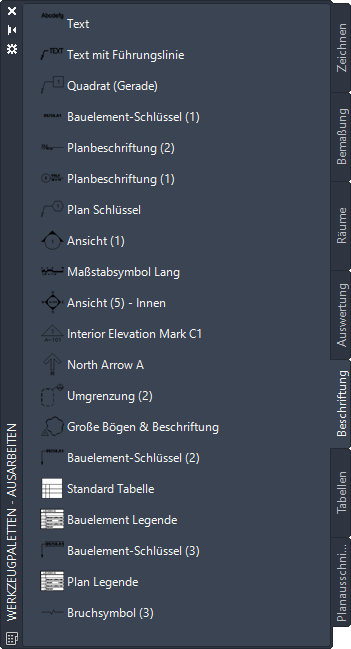 Mit Beschriftungswerkzeugen können Sie Beschriftungsobjekte erstellen, die auf bestimmte Beschriftungsmaßstäbe reagieren. Ein Beschriftungswerkzeug ist ein anpassbares AutoCAD Architecture 2027-Toolset-Werkzeug, mit dem die folgenden Arten von Beschriftungen zu Zeichnungen hinzugefügt werden können: