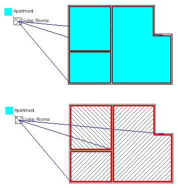 Übergeben von Zonenschraffur an alle hinzugefügten Räume (oben) oder nur an direkt hinzugefügte Räume (unten)