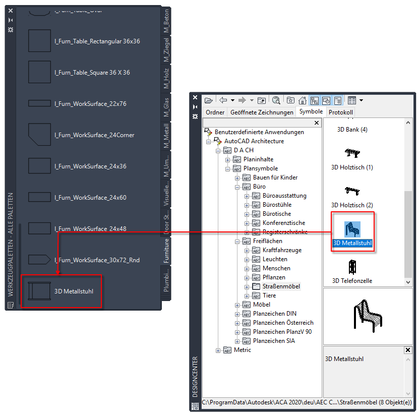 Sie können Symbole von einem DesignCenter-Ordner ziehen und auf einer Werkzeugpalette ablegen.