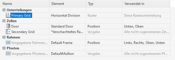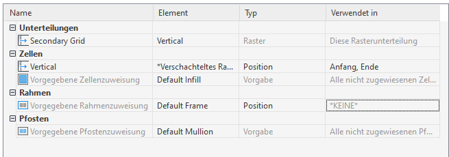 Sie können in der Registerkarte Gestaltung des Dialogfelds Eigenschaften für Fassadenstil verschachtelte Raster definieren. Die Raster werden im linken Fensterausschnitt in einer Baumstruktur aufgeführt. Es gibt immer ein Primärraster. Das Primärraster kann ein oder mehrere Sekundärraster haben. Jedes sekundäre Raster kann ein oder mehrere Tertiärraster haben, usw.