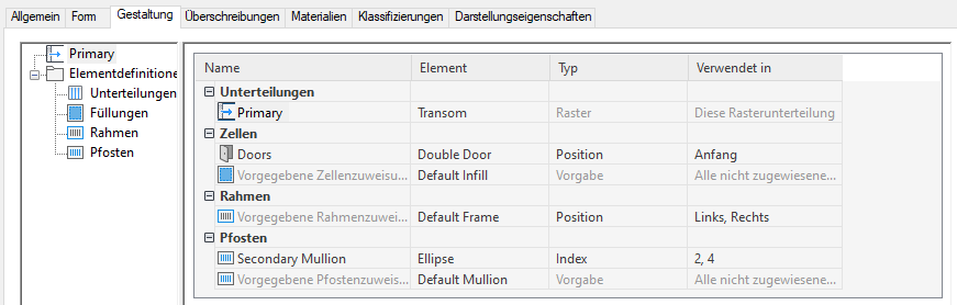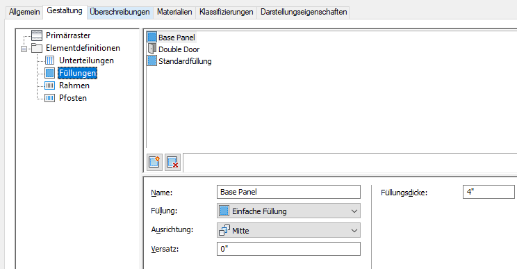 Sie können Elementdefinitionen mithilfe der Registerkarte Gestaltung des Dialogfelds Stileigenschaften für Tür-Fenster-Kombination ändern. Sie können von der Zuweisungsliste und von der Definitionsliste aus auf diese Definitionen zuzugreifen.