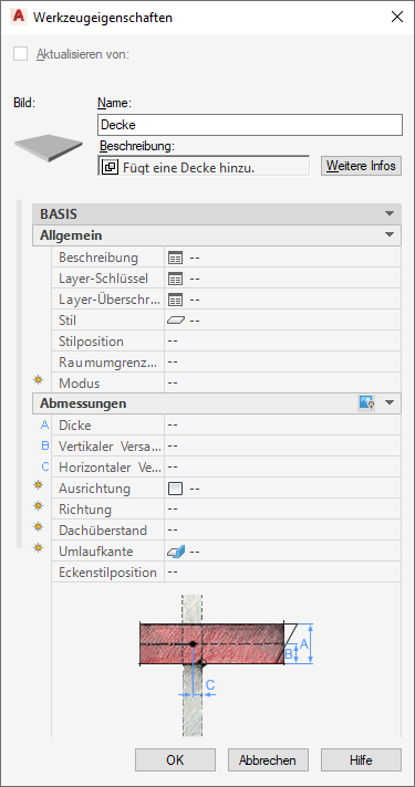Decken-Werkzeugeigenschaften mit einem vorgegebenen Deckenkantenstil als Standard