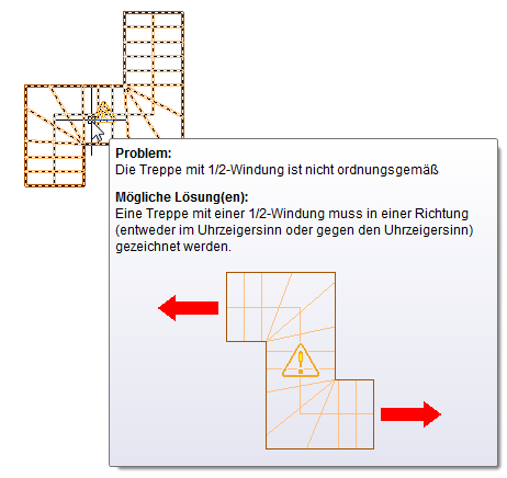 Wenn AutoCAD Architecture 2027-Toolset ein Problem beim Zeichnen des Treppenobjekts erkennt, wird ein Lösungshinweissymbol für die Treppe in der Zeichnung angezeigt.