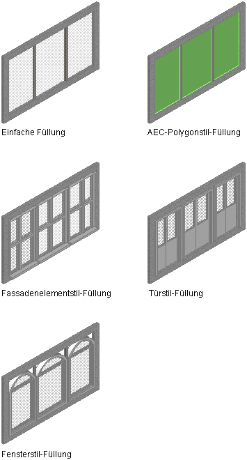 Durch Füllungen wird der Inhalt von Zellen in Tür-Fenster-Kombinationen definiert. Eine Zelle in einer Tür-Fenster-Kombination kann ein einfaches Standardelement, aber auch ein verschachteltes Raster, ein AEC-Polygon, ein Fassadenelement oder eine Tür oder ein Fenster mit einem bestimmten Stil enthalten. Die Objektstile, die Sie bei Füllungen verwenden, müssen jedoch in der aktuellen Zeichnung als Füllungsdefinition vorhanden sein. Füllungen weisen i. d. R. Verglasungen oder andere einfache Verkleidungen auf, beispielsweise aus Stein oder Beton.
