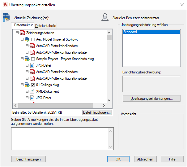 Bei der elektronischen Übertragung können Sie die Zeichnung in elektronischer Form als Paket übermitteln. Die Zeichnungsdateien im Übertragungspaket enthalten auch alle relevanten Zusatzdateien wie externe Referenzen und Schriftartendateien.