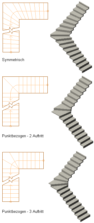 Mit den punktbezogenen Verziehungsstilen können Sie Auftrittskanten oder Steigungsflächen am Drehungsmittelpunkt der Verziehung ausrichten und der Stufenverziehung einzelne Auftritte hinzufügen oder daraus entfernen. Bei punktbezogenen Verziehungsstilen ist es darüber hinaus möglich, einer Stufenverziehung eine feste Anzahl von Auftritten zuzuweisen, wodurch die angegebene Auftrittanzahl in der Treppendrehungszone eingefügt wird.