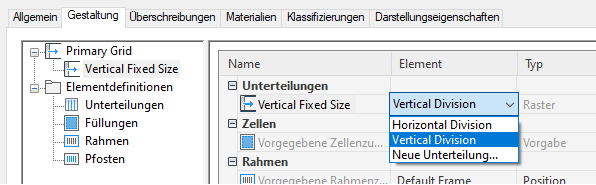 Gehen Sie wie folgt vor, um eine Unterteilung einem Fassadenelementraster zuzuordnen. Eine Unterteilung definiert die Rasterausrichtung (ob die Richtung der Rasterzellen und Pfosten horizontal oder vertikal ist) sowie den Unterteilungstyp (Zellenanzahl und -größe).