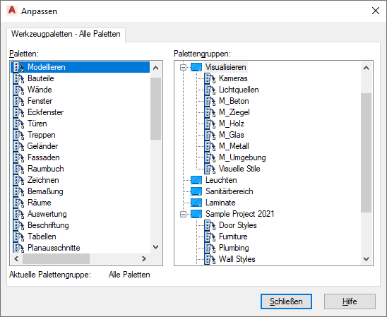 . - Enthält die projektspezifische Werkzeugpalettengruppe mindestens eine Palette, wird sie in der Liste der verfügbaren Werkzeugpalettengruppen angezeigt und kann ausgewählt werden.