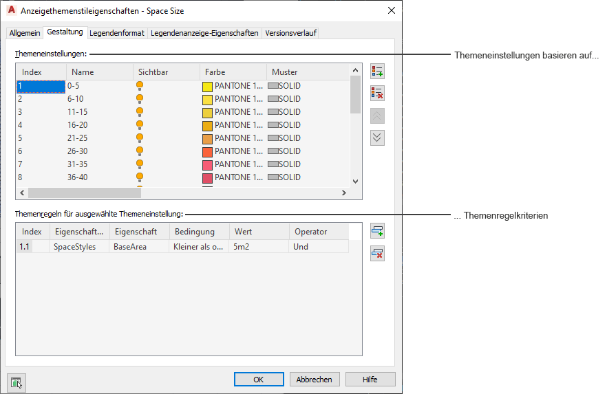 Die Legende eines Anzeigethemas ist der Schlüssel, mit dem bestimmte Farben, Füllungen oder Schraffuren den Eigenschaften von Objekten in der Zeichnung zugeordnet werden. Sie fügen eine Anzeigethemenlegende in eine Zeichnung ein, um ein Anzeigethema zu aktivieren und die Darstellung von Objekten zu ändern, indem Sie die aktuellen Darstellungseigenschaften außer Kraft setzen.