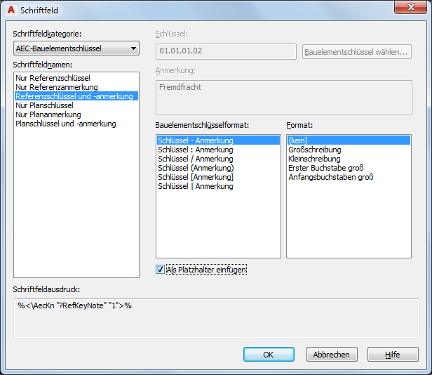 - Stellen Sie sicher, dass im Dialogfeld Schriftfeld die aktuelle Schriftfeldkategorie auf AEC-Bauelementschlüssel gesetzt ist, und wählen Sie unter Feldnamen ein Format aus. Bei Auswahl der Option für Schlüssel und Anmerkung können Sie zusätzlich auch eine Option unter Bauelementschlüsselformate auswählen. Sie können die Einstellung nach Wunsch auch unter Format ändern.