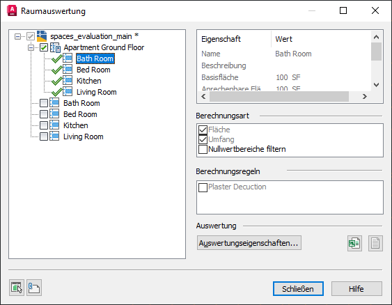 - Wählen Sie die Räume und Zonen aus, die in der Auswertung des Grundrisses enthalten sein sollen, indem Sie ihre Kontrollkästchen aktivieren.