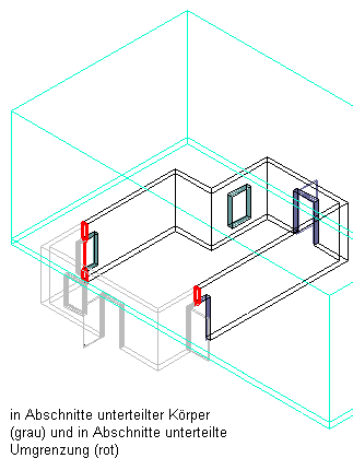 3D-Modellschnittansicht mit geschnittenem Körper (grau) und geschnittener Umgrenzung (rot)