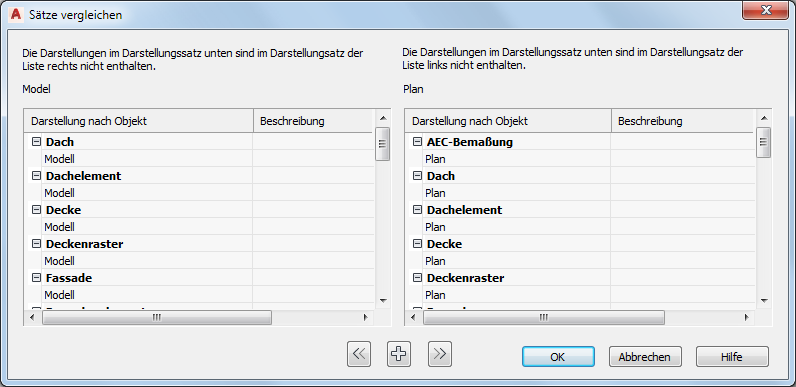Im Dialogfeld Sätze vergleichen können Sie einem der beiden Darstellungssätze eine oder mehrere Darstellungen zuweisen.