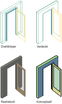 Mit den visuellen Stilen Drahtkörper, Verdeckt, Realistisch und Konzeptuell dargestellte Türen