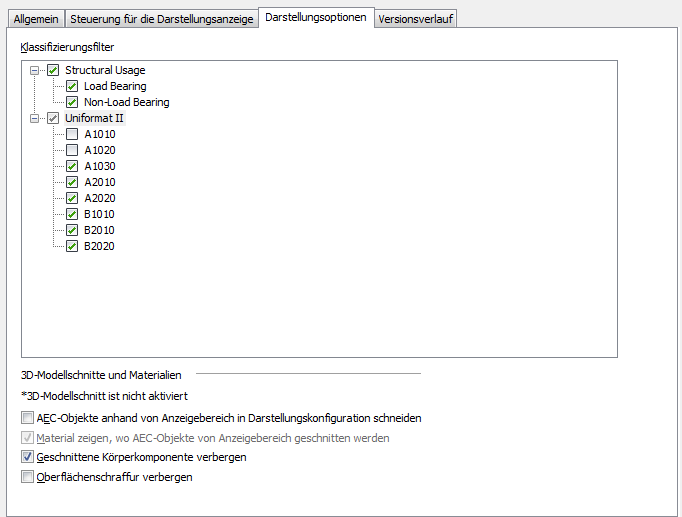 Um beispielsweise alle Türen und Wände mit der Klassifizierung A1010 und A1020 ausblenden zu lassen, deaktivieren Sie die entsprechenden Kontrollkästchen unter Uniformat II.