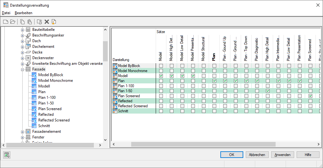 Im rechten Fensterausschnitt werden in den Zeilen die Darstellungen aufgeführt, die für dieses Objekt vorhanden sind, und in den Spalten die Darstellungssätze. Ein Häkchen unterhalb eines Darstellungssatzes zeigt an, dass die Darstellung in diesem Darstellungssatz verwendet wird. Eine Darstellung kann in mehreren Darstellungssätzen verwendet werden.