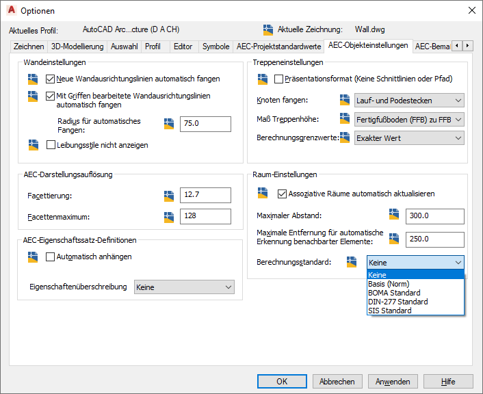 Das folgende Beispiel zeigt den Aufruf für das Beispielprojekt AecSpaceOffsetStandardSample, das sich selbst in der Software als Basis-Flächenberechnungsstandard registriert.