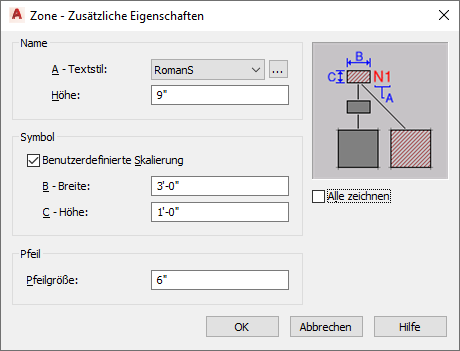 Anmerkung: Um die Änderungen auf alle Zonen in der Zeichnung anzuwenden, wählen Sie Zeichnungsvorgabe-Einstellung. Um die Änderungen auf alle Zonen mit diesem Stil anzuwenden, wählen Sie Zonenstil: <Stilname>.