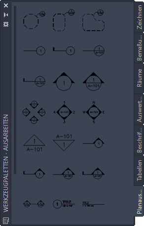 Ein Symbolwerkzeug für Innenansichten mit vier Richtungen im Format N/S/O/W. Die Ansichtssymbole haben einen Feldplatzhalter für die Plannummer, der aufgelöst wird, wenn die Ansichten in einen Plan eingefügt werden. |