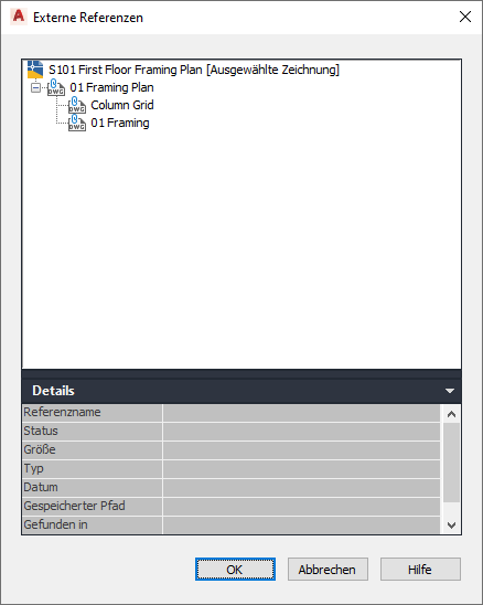 7. Zeigen Sie im Dialogfeld Externe Referenzen die Details der XRef an.