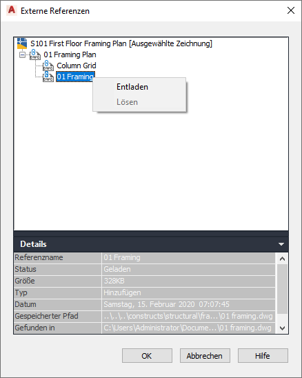 Die angehängte XRef kann über das Kontextmenü entladen, neu geladen oder gelöst werden.
