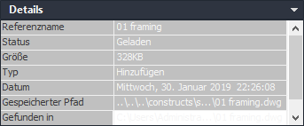 • Gefunden in zeigt den Pfad an, in dem die XRef gefunden wurde. Wenn kein Pfad für die XRef gespeichert wurde oder die XRef nicht mehr im angegebenen Pfad enthalten ist, sucht das Programm nach der XRef und zeigt den Speicherort hier an.