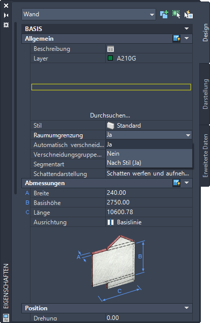 - Zeigen Sie in der Eigenschaftenpalette die Einstellung Raumumgrenzung wie folgt an: