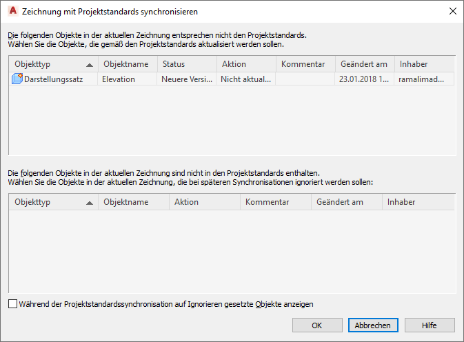 In diesem Fall bleibt die nicht standardmäßige Version bei dieser Synchronisation im Projekt erhalten, wird also nicht aktualisiert. Wenn die Zeichnung das nächste Mal synchronisiert wird, wird der Stil bzw. die Anzeigeeinstellung erneut als ältere oder nicht standardmäßige Version angezeigt.