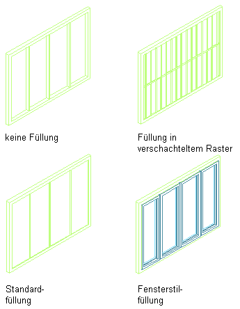 Durch Füllungen wird der Inhalt von Zellen in Tür-Fenster-Kombinationen definiert. Eine Zelle in einer Tür-Fenster-Kombination kann ein einfaches Standardelement, aber auch ein verschachteltes Raster, ein AEC-Polygon, ein Fassadenelement oder eine Tür oder ein Fenster mit einem bestimmten Stil enthalten. Die Objektstile, die Sie bei Füllungen verwenden, müssen jedoch in der aktuellen Zeichnung als Füllungsdefinition vorhanden sein. Füllungen weisen i. d. R. Verglasungen oder andere einfache Verkleidungen auf, beispielsweise aus Stein oder Beton.