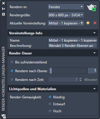 Rendern nach Ebene. Gibt die Anzahl der Ebenen oder Wiederholungen an, die die Render-Engine ausführt, um das gerenderte Bild zu erstellen. RENDERLEVEL (Systemvariable)