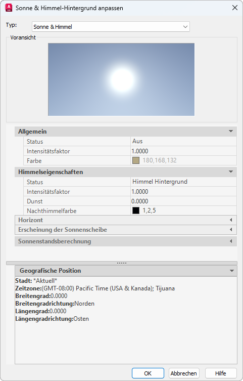 Definiert die Position, Farbe und Effekte der Sonne und des Himmels für eine Ansicht.