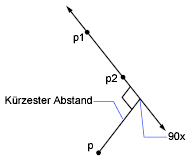 Bestimmt den kürzesten Abstand zwischen dem Punkt P und der Linie durch die Punkte P1 und P2.