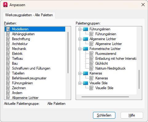 Im Fenster Werkzeugpaletten werden alle verfügbaren Werkzeugpaletten angezeigt. Außerdem können Sie Werkzeugpalettengruppen erstellen und verwalten.