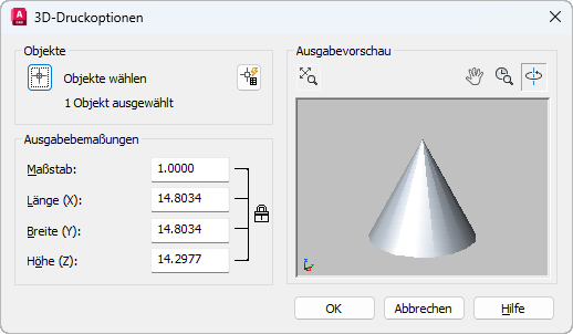 Legt 3D-Ploteinstellungen fest und bereitet die Zeichnung für den 3D-Druck vor.