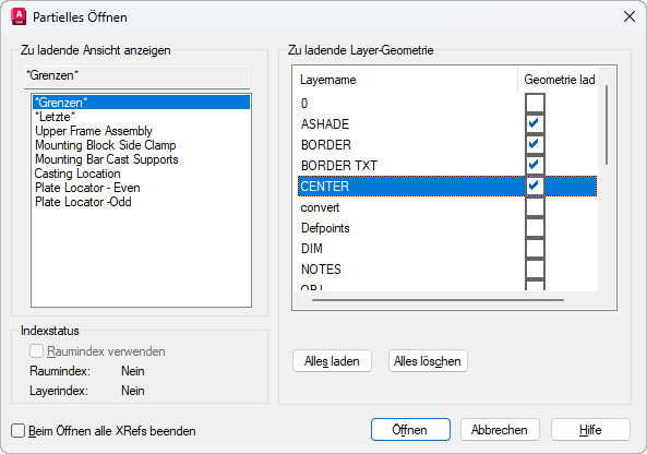 Wenn eine Zeichnung partiell geöffnet ist, werden alle benannten Objekte sowie die angegebene Geometrie in die Datei geladen. Die benannten Objekte umfassen Blöcke, Bemaßungsstile, Layer, Layouts, Linientypen, Textstile, BKS, Ansichten und Ansichtsfensterkonfigurationen.